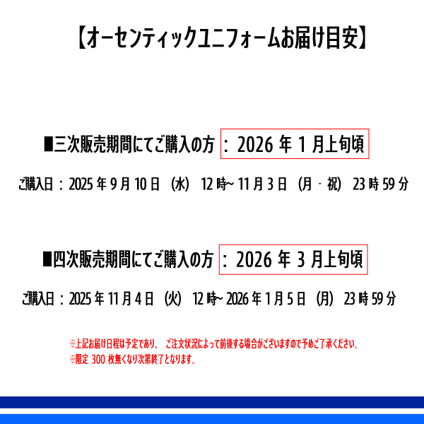 1st(青)ユニフォーム・2nd(白)ユニフォームの2色展開で限定300枚の先着販売となりますので、お早めにお買い求めください。